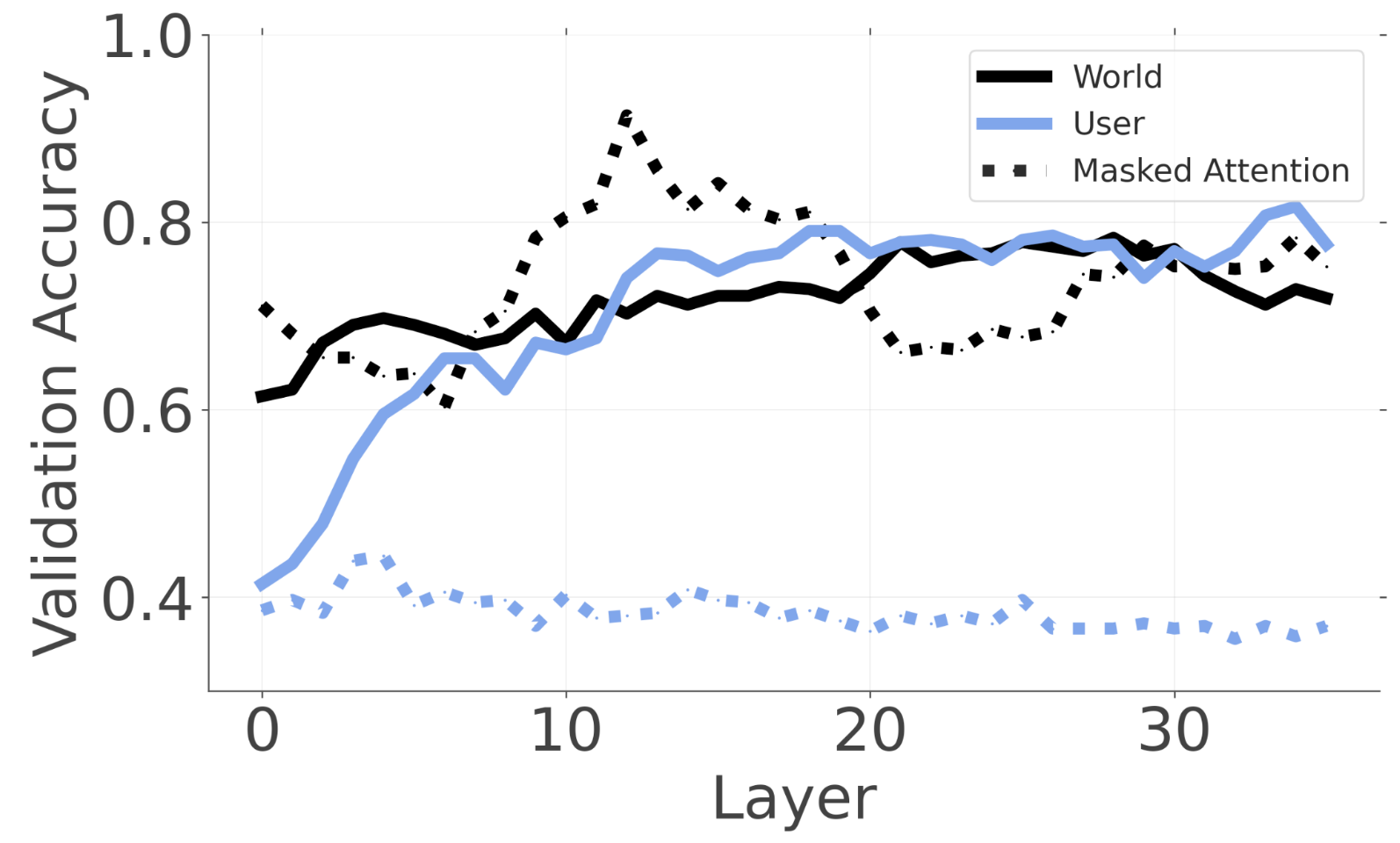 Under attention masking, p(user) accuracy drops to 38-40%, while p(world) remains above 80%. Because I apply the mask across all layers and heads and retrain probes under the same intervention, this result suggests the belief signal is not simply moving elsewhere in representation space. Instead, it is substantially dependent on access to belief-bearing context via attention. This suggests the linearly decodable user-belief signal at readout time depends on attention access to the belief-bearing span, rather than being robustly carried forward without retrieval.